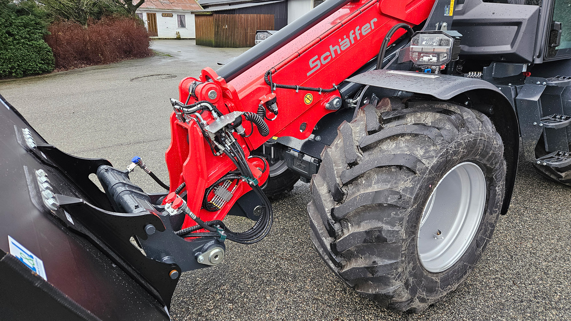 Allerede første dagen overbeviste Schäfferen. Teleskoplasteren er nemlig levert med en Quicke GL+ 260 universalskuff. Med en bredde på 2,6 meter kunne Ove kjøre helt inntil veggen.